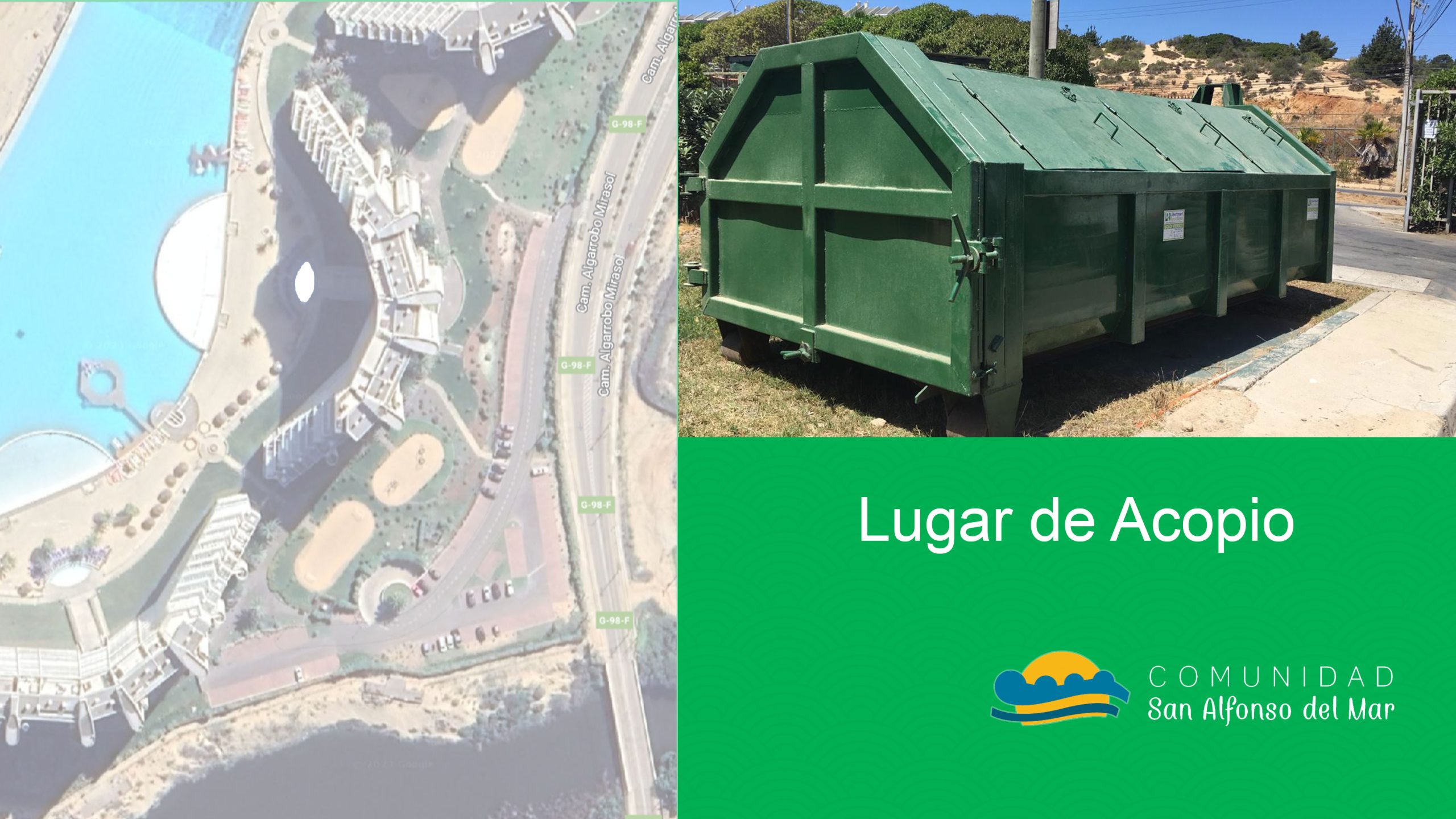 Hemos dispuesto en los accesos de dos edificios del Condominio, un contenedor de color amarillo donde pueden desechar directamente sus residuos compostables y así , colaboramos para que San Alfonso de Mar sea en una comunidad sustentable y responsable con el medio ambiente.